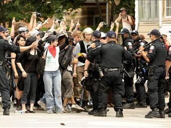 La manifestación convocada en Toronto en contra del G20 se transformó en un violento enfrentamiento con la policía que dio como resultado al menos 75 detenidos, varios heridos, coches incendiados y una sensación de caos en torno al protegido perímetro de seguridad de la cumbre