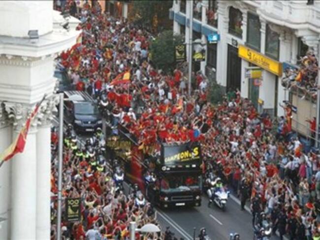 A continuación, el autobús de la selección nacional re-emprendió su recorrido por las calles de Madrid, a lo largo de las cuales la multitud, con banderas de España y ataviada con camisetas de rojo y amarillo, le vitoreaba y pedía autógrafos a los jugadores
