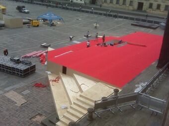 Una tarima de unos 300 metros cuadrados de superficie fue levantada superando los desniveles del piso para dejarla al nivel del andén principal del Capitolio Nacional, en la misma plaza, donde se realizará el evento. Sobre la tarima han colocado dos alfombras rojas