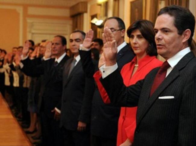Uno a uno, los nuevos ministros y secretarios firmaron el acta que los acredita como altos funcionarios de la Presidencia de la República. Nuevo equipo del Presidente Santos Calderón: Ministro del Interior y de Justicia, Germán Vargas Lleras Ministro de Defensa, Rodrigo Rivera Ministro de Hacienda y Crédito Público, Juan Carlos Echeverry Ministro de Agricultura, Juan Camilo Restrepo Ministro de la Protección Social, Mauricio Santamaría Salamanca Ministro de Minas y Energía, Carlos Rodado Ministro de Transporte, Germán Cardona Ministro de Comercio, Industria y Turismo, Sergio Díaz Granados Ministra de Relaciones Exteriores, María Ángela Holguín Ministra de Educación, Doris María Fernanda Campo Ministra de Ambiente, Sandra Bessudo Lion Ministra de Vivienda, Beatriz Uribe Botero Ministra de Cultura, Mariana Garcés Córdoba Director de Planeación Nacional, Hernando José Goméz Secretario General de la Presidencia, Juan Carlos Pinzón Secretario para la Seguridad Presidencial, general Luis Gilberto Ramírez Secretario de Prensa, John Jairo Ocampo