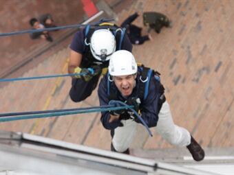 El ministro del Interior, Germán Vargas Lleras, se lanzó a través de cuerdas desde el octavo piso de su despacho, en el simulacro de evacuación realizado en Bogotá