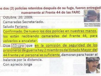 De igual forma, hay correos electrónicos según los cuales dos de los policías secuestrados por las Farc se escaparon el 15 de septiembre de 2009 y fueron recapturados el 16 de octubre, cuando alias "Mono Jojoy" le comunicó al secretariado que habían sido "resecuestrados" y ahora serían nuevamente "encaletados"