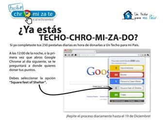 A media noche o la primera vez del día en abrir Google Chrome, el sistema preguntará a quién quiere entregar los puntos, y para donarlos a Un Techo para mi País se debe: Ingresar la cuenta de Gmail, hacer clic en el botón que señala “Google Crhome for a Cause”, entre las cinco opciones se debe elegir “Square teet for Shelter”, pies cuadrados en techo, que significa apoyar a Un Techo Para mi País, y realizar la misma acción hasta el 19 de Diciembre