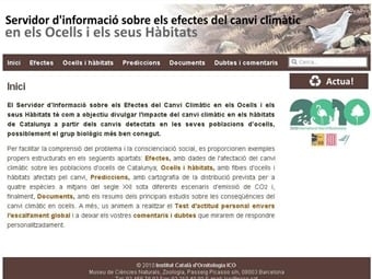 Así, en la página se explica qué es el cambio climático y sus efectos y se ofrecen datos de su afectación sobre las poblaciones de pájaros de Cataluña, predicciones y una cartografía de la distribución prevista para cuatro especies a mediados del siglo XXI bajo diferentes escenarios de emisión de dióxido de carbono (CO2)