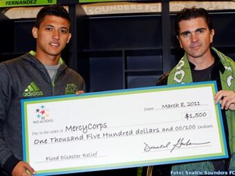 Montero recibió al cantante con una camiseta de su club, mientras que Juanes le entregó un cheque de parte de la fundación caritativa de la MLS a nombre de Mercy Corps obra que, con el apoyo del delantero, ayuda a los necesitados en Colombia