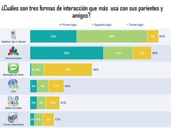 91% de los encuestados afirmó que el celular es una de las tres formas que más utilizan para comunicarse con sus parientes y familiares. Esta cifra supera incluso el 86% que corresponde al contacto personal (ver imagen)