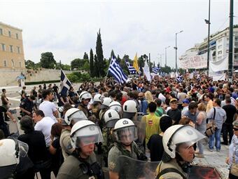 Más de 25.000 personas participan en la manifestación frente al Parlamento de Atenas en contra de las duras medidas de ahorro del Gobierno, mientras el país vive hoy su tercera huelga general del año
