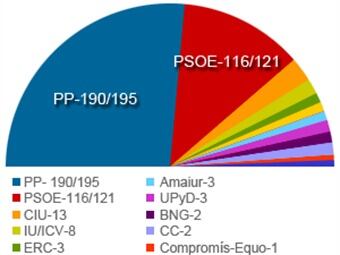 El PP vencería con un amplia mayoría absoluta, al superar de largo el mínimo de 176 escaños que establece la ley electoral entre los 350 que componen el Congreso de los Diputados