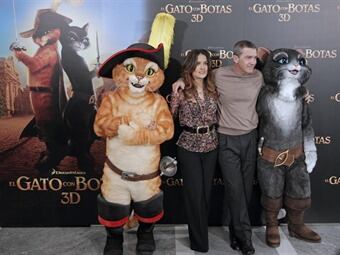 La espera terminó a las 20.00 horas, cuando hicieron su aparición Banderas y Hayek, que en la película prestan su voz a Puss y a la gatita Kitty Softpaws, respectivamente