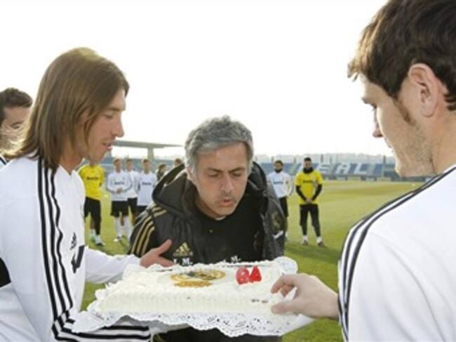 Iker Casillas y Sergio Ramos, capitanes del Real Madrid, sorprendieron a José Mourinho el día de su cumpleaños al ofrecerle una tarta con la que celebrar el 49 aniversario del técnico portugués, justo antes de comenzar esta tarde el entrenamiento en Valdebebas