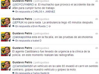 El alcalde de Bogotá Gustavo Petro, mediante su cuenta en twitter, reveló que uno de sus escoltas motorizados resultó lesionado luego que un automóvil los envistiera en la calle 85 con carrera once