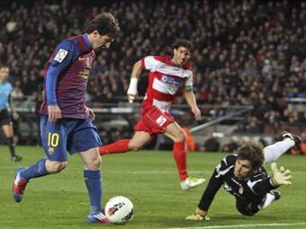 Messi fue determinante para la victoria de su equipo que se sitúa a cinco de la cabeza del Campeonato y suma 34 goles en la Liga, con lo que se convierte en el máximo goleador del torneo, en un partido extraño, dominado a placer por los azulgrana en el primer tiempo y que llegó a empatar el equipo de Abel Resino en la segunda mitad. Fue, además, la mejor manera que tuvo el argentino de rendir homenaje a la delantera del Barça de la ''Cinco Copas'', acabó con el récord de César y lo hizo el día en el que el Camp Nou rindió homenaje al fallecido Estanislao Basora. Cuatro minutos, el primer gol, y en diecisiete, el partido parecía liquidado. Jugó el Barcelona muchos minutos con la marcha reductora, sin la necesidad de acelerar sus acciones más allá de lo necesario frente a un rival que apenas le exigió, ni siquiera en el plano físico, que cuando los andaluces igualaron el marcador, los azulgrana tuvieron todas las dudas. Era el partido de Messi, que afrontaba la primera oportunidad de igualar el récord de goles de César Rodríguez en partidos oficiales con el Barça. Y el argentino, como siempre, respondió a las expectativas. De salida, se movió el equipo de Guardiola al son de Xavi y con la electricidad de Isaac Cuenca. El canterano, pegado a la línea de cal, desbordó en cuanto se lo propuso a Cortés y generó múltiples opciones con sus jugadas desde la izquierda. Y Cuenca lo intentó desde el primer minuto. En el cuatro regateó al lateral, puso el balón en el segundo palo y Messi asistió de cabeza a Xavi. El ''seis'' del Barça, en su mejor temporada como goleador, no perdonó en la primera que tuvo. El Granada mostró todas sus dudas y dejó jugar demasiado a los azulgranas. Sin embargo, en el inicio del segundo tiempo, una falta botada desde la izquierda fue rematada por Mainz y, casi sin buscarlo, el equipo de Abel Resino se encontró con el 2-1 (m.55) y creyó en el milagro. Pagó cara el Barça su indolencia, pero la sorpresa fue en aumento, cuando en una jugada de Dani Benítez con Alves acabó en penalti. Siqueira (2-2, m.62) transformó la pena máxima y el Granada, cabizbajo hasta entonces, había resucitado sin saber muy bien cómo. Eligió un buen momento Messi para rescatar a su equipo y convertirse en el máximo goleador de la historia del club. El argentino recibió de Alves y batió a Julio César con una sutil vaselina. Era el 3-2, el tanto 233, en una jugada en la que la defensa del Granada reclamó que Messi se encontraba en fuera de juego. El cuarto de hora final fue para Iniesta y Tello, quienes entraron por Alexis y Thiago. Se dedicó el Barcelona a controlar el partido. Entró Geijo por Ighalo para forzar la situación, pero quien triunfó fue Cristian Tello. A ocho minutos para el final, el Barça respiró en una acción magistral de Iniesta y, sobre todo, el gol de Tello, un jugador que aprovecha al máximo los minutos que Guardiola le da. Hoy el eléctrico extremo cazó un rechace dentro del área para sentenciar el partido con un remate con efecto al palo largo del portero. Pero no acabó aquí el partido. En ocho minutos, aún hubo tiempo de ver dos goles más y una expulsión. Messi cerró su actuación con un triplete y elevó a 234 goles sus tantos como barcelonista y convertirse además en máximo goleador del campeonato con 34. El expulsado fue Dani Alves, por tocar el balón con la mano