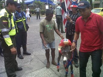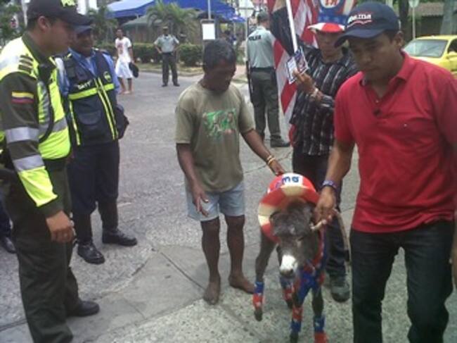 La pintura con el rostro de Obama, la canción de champeta ‘La Sexta Cumbre’ y el burrito Demo, los tres regalos que esperan en las calles de Cartagena a que los reciba el primer mandatario de los Estados Unidos, es este último quien al parecer ya logró ser visto por su posible dueño