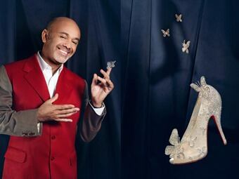El diseñador francés ha aunado en sus zapatos para Cenicienta, además de sus conocidas suelas rojas, un encaje adornado con cristales y dos mariposas, una en el empeine y la otra en unos espectaculares tacones que prolongan la figura hacia el tobillo