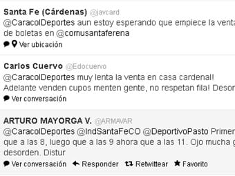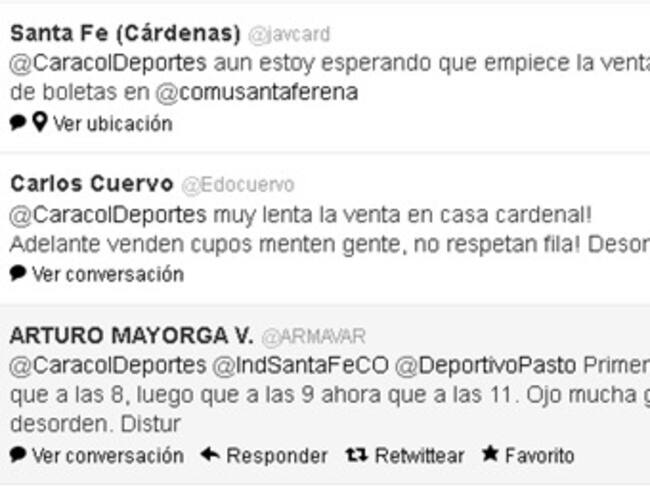 Aquí algunas opiniones de los seguidoores de @caracoldeportes:Carlos A Benavides S @carlosbe28 @caracoldeportes yo creo Q si el aforo del Campin fuera de 300,000 aficinados no alcazarian las boletas, voy bien estoy a 150 personasSanta Fe (Cárdenas) @javcard @CaracolDeportes aun estoy esperando que empiece la venta de boletas en @comusantaferenaCarlos Cuervo @Edocuervo @CaracolDeportes muy lenta la venta en casa cardenal! Adelante venden cupos menten gente, no respetan fila! DesordenJULIAN GAMA FLOREZ @juliangamaf @CaracolDeportes pesima la logistica, @TicketShopCol no aparece, se burlan d compradores, nadie dice nada.... Se vienen disturbios...