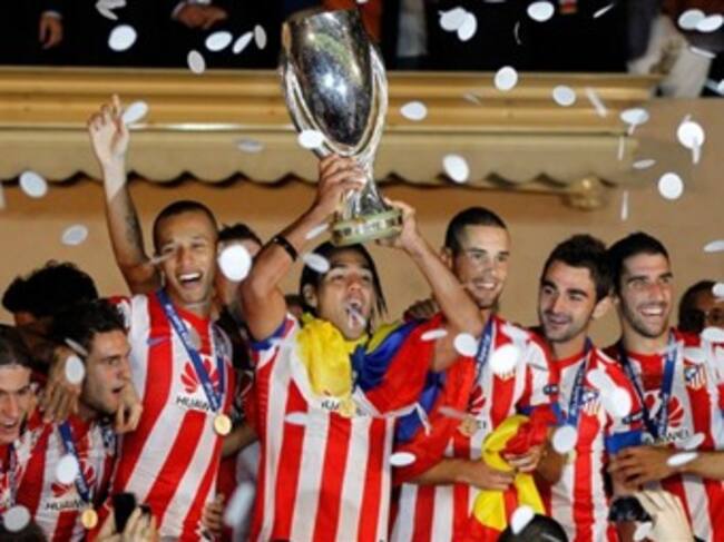 El presidente Juan Manuel Santos felicitó al delantero Radamel Falcao García, autor de tres de los cuatro goles con los que el Atlético de Madrid español ganó la Supercopa de Europa al Chelsea inglés por 4-1