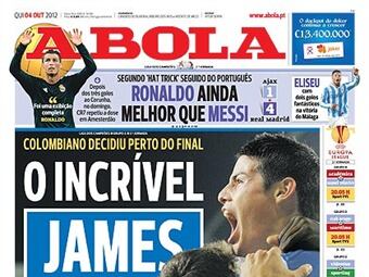 "El increíble James", titula en su primera página el diario "A Bola", en un juego de palabras que refleja que el mediapunta colombiano es ya considerado la estrella del equipo en sustitución del también apodado como "Increíble" Hulk, quien abandonó hace un mes Portugal para recalar en el Zenit ruso