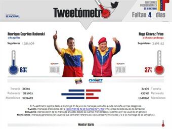 Según los datos procesados por el Tweetómetro (una herramienta desarrollada por El Nacional para medir el pulso de la campaña electoral en Twitter), en poco más de tres meses se registró un total de 8.246.380 tuits relacionados a las 40 cuentas más influyentes de los dos equipos de campaña. Más de 62 % de esos mensajes (5.131.662) corresponden al tuitero Capriles