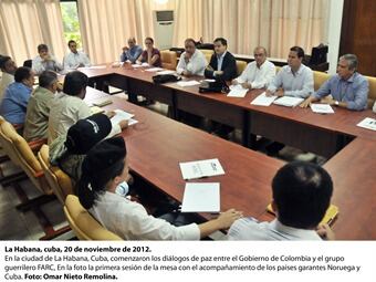 Hoy se conocieron las primeras imágenes de las reuniones, en las que se puede ver a las delegaciones completas, con 10 integrantes cada una, frente a frente y en las cabeceras de la mesa los delegados de Noruega y Cuba como garantes