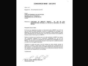 En su carta al mintic Galán recomienda que ante la inmediatez de la adjudicación pide atender las denuncias de otro de los interesados en el contrato, quien en una audiencia el pasado miércoles habló de las presuntas falsedades sin que sus señalamientos fueran tenidos en cuenta