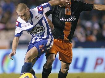 El Deportivo, con un centrocampista como lateral (Jesús Vázquez) se atrincheró en su campo y, gracias a Aranzubia, que despejó con la pierna un remate a bocajarro del paraguayo Nelson Valdez, mantuvo el empate hasta que en el tiempo de descuento Ricardo Costa le dejó sin botín y hundido, con 16 puntos en 21 partidos. - Ficha técnica: 2 - Deportivo de La Coruña: Aranzubia; Manuel Pablo, Aythami, Zé Castro, Sílvio; Álex Bergantiños, Assunçao; Bruno Gama (Camuñas, min.77), André Santos (Jesús Vázquez, min.63), Pizzi; y Riki (Nélson Oliveira, min.69). 3 - Valencia: Diego Alves; Joao Pereira, Rami, Ricardo Costa, Guardado; Víctor Ruiz (Bernat, min.55), Tino Costa; Piatti, Banega (Canales, min.85), Jonas (Jonathan Viera, min.46); y Valdez. Goles: 0-1, min.1: Jonas. 1-1, min.32: Riki. 2-1, min.45+2: Riki