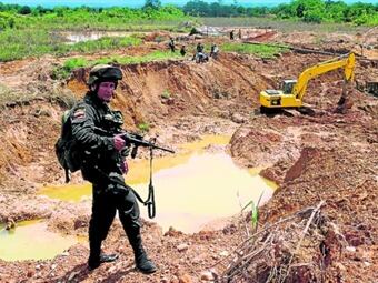 En este lugar se incautaron dos retroexcavadoras, tres clasificadoras de rodillos y tres motobombas. Las investigaciones indican que esta mina ilegal de oro estaría siendo administrada temporalmente por la guerrilla de las FARC.