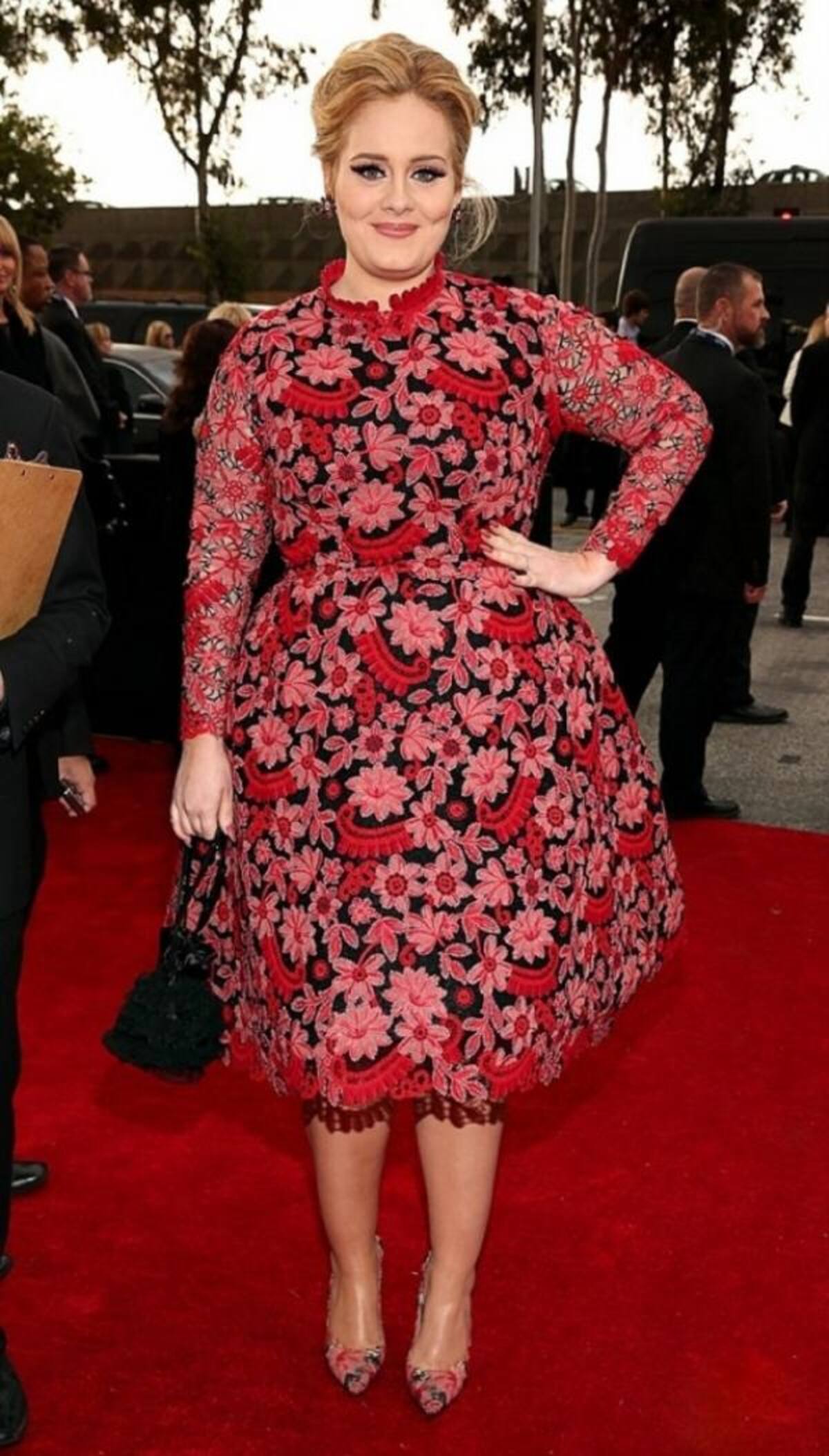 La cantante Adele se decidió por un modelo floral de Valentino Couture, de cuello redondo y mangas en transparencia, que no resultó favorecedor, pues hacía lucir su figura más robusta.