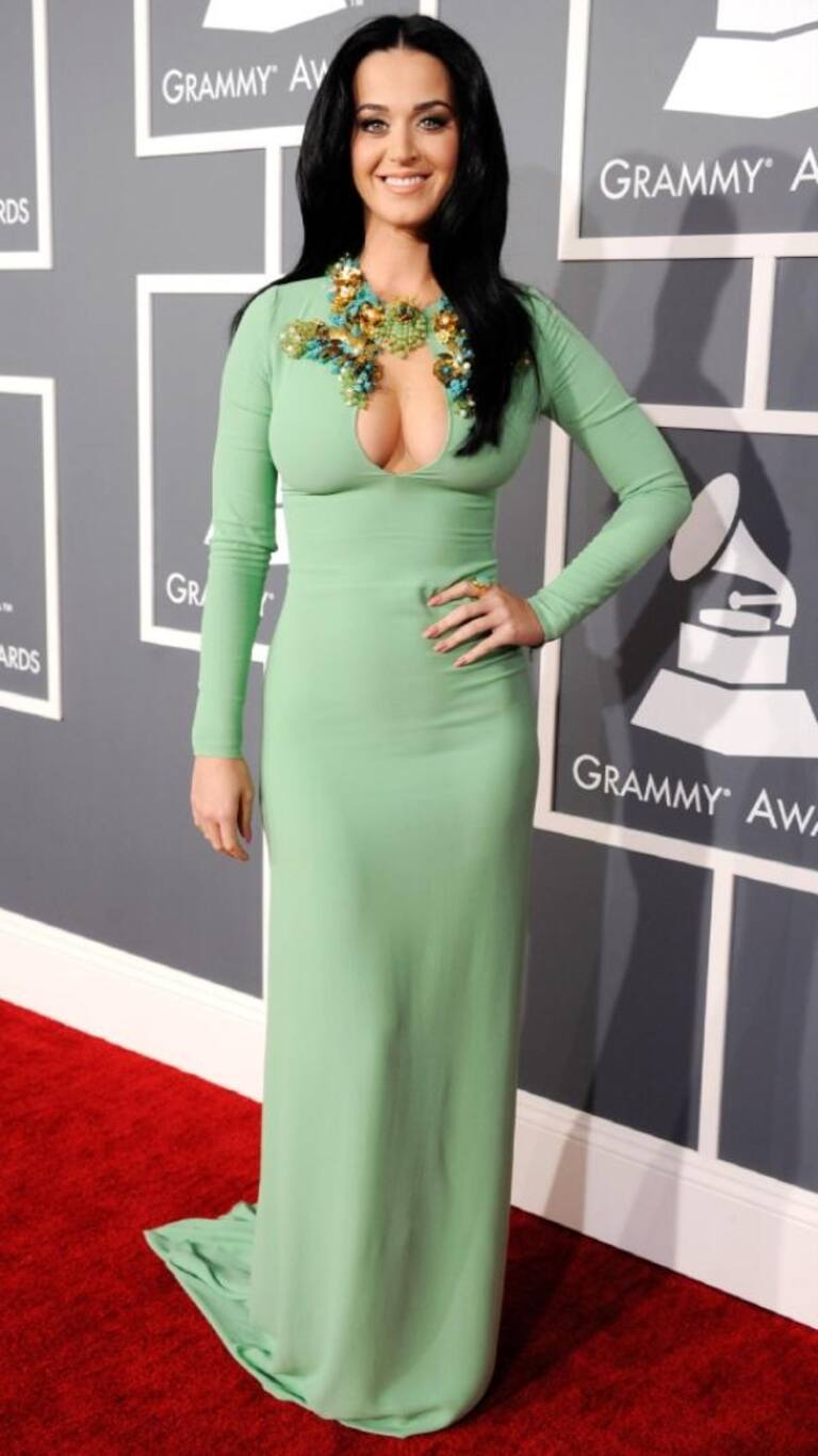 Katy Perry fue una de las peor vestidas de la noche gracias a este traje de manga larga en color verde menta, elaborado por Gucci que resaltaba su pronunciado escote de forma ovalada, que no estaban permitidos en la gala.
