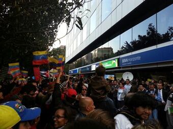 Este miércoles en la noche se realizó un plantón frente a la Embajada a la que asistieron decenas de personas con pancartas, camisetas, velas, banderas venezolanas, y otros elementos alusivos al presidente Hugo Chávez