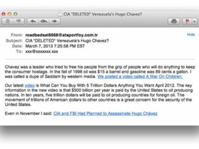 Según la entidad, con archivos que han bautizado a manera de pregunta ¿La CIA "eliminó" a Hugo Chávez?, "los criminales cibernéticos lo utilizan como enganche para infectar a las víctimas"