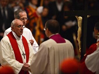 El papa Francisco presidió este Viernes Santo en el Coliseo de Roma el primer Vía Crucis de su pontificado, en el que dijo que la Cruz de Jesús es la "palabra" con la que Dios ha respondido al mal del mundo y que los cristianos tienen que responder al mal con el bien. Ante varias decenas de miles de personas que acudieron al Coliseo romano para el sugestivo rito, el pontífice manifestó que no quería añadir muchas palabras, "ya que en esta noche debe permanecer sólo una palabra, que es la Cruz misma". "La Cruz de Jesús es la palabra con la que Dios ha respondido al mal del mundo. A veces nos parece que Dios no responde al mal, que permanece en silencio. En realidad ha hablado, ha respondido y su respuesta es la Cruz de Cristo", afirmó el papa Bergoglio. El pontífice subrayó que la Cruz es amor, misericordia, perdón y también juicio. "Dios nos juzga amándonos, si acojo su amor estoy salvado, si lo rechazo me condeno, no por él, sino por mí mismo, porque Dios no condena, Él sólo ama y salva. No olvidéis esto", aseguró. El papa argentino manifestó también que la Cruz es asimismo la respuesta de los cristianos al mal que sigue actuando en nosotros y a nuestro alrededor y que los seguidores de Jesús deben responder al mal con el bien, tomando sobre sí la Cruz, como Jesús". El pontífice destacó que las meditaciones de las 14 estaciones del Vía Crucis han sido escritas por jóvenes libaneses y les agradeció "el testimonio" que dan. "Lo hemos visto cuando el papa Benedicto fue al Líbano (el año pasado), hemos visto la belleza y la fuerza de la unidad de los cristianos de aquella Tierra y de la amistad de tantos hermanos musulmanes y muchos otros. Es un signo de esperanza para Oriente Medio y para el mundo entero". El Vía Crucis discurrió por el interior del Coliseo -el famoso anfiteatro Flavio, que recuerda los sufrimientos de los primeros cristianos-, continuó por delante del Arco de Trajano y concluyó en la colina del Palatino, desde donde lo presidió el papa. La cruz fue portada por el cardenal vicario de Roma, Agostino Vallini, por una familia italiana y otra india, por un enfermo y varios voluntarios y por dos seminaristas chinos. También lo portaron dos frailes franciscanos de la Custodia de Tierra Santa, un religioso nigeriano y otro libanés y dos jóvenes de Brasil, donde se celebrará la Jornada Mundial de la Juventud (JMJ) en julio próximo.