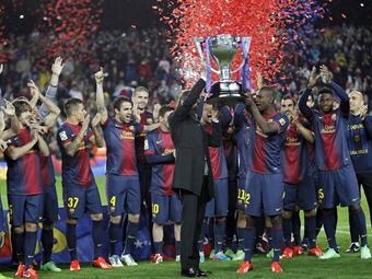 El Barcelona recibió el trofeo de campeón de Liga 2012/13, de manos del presidente de la Real Federación Española de Fútbol, Ángel María Villar, tras vencer 2-1 al Valladolid en el Camp Nou