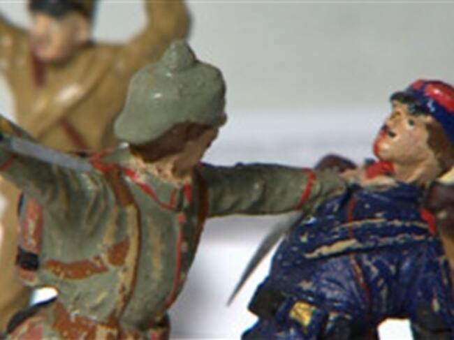 Uno de los juguetes de la muestra simboliza la muerte de un soldado francés a manos de uno alemán durante la Primera Guerra Mundial