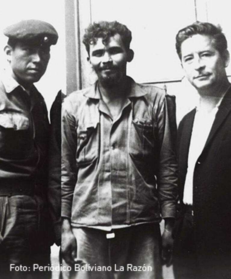 En esta imagen, dos miembros del ejército custodian a Orlando Jiménez Bazán, El ‘Camba’ (centro), quien en septiembre de 1967 pidió desertar de la guerrilla y al día siguiente fue capturado y llevado a un Tribunal Militar. Se supo que El ‘Campa’ no era de los más cercanos hombres del Che, y según La Razón, en prisión fue sometido a torturas y habría dado algunos datos de sus excamaradas.