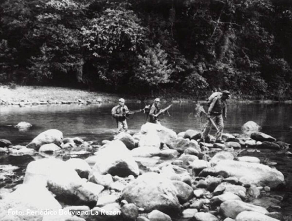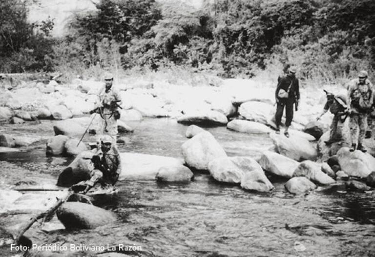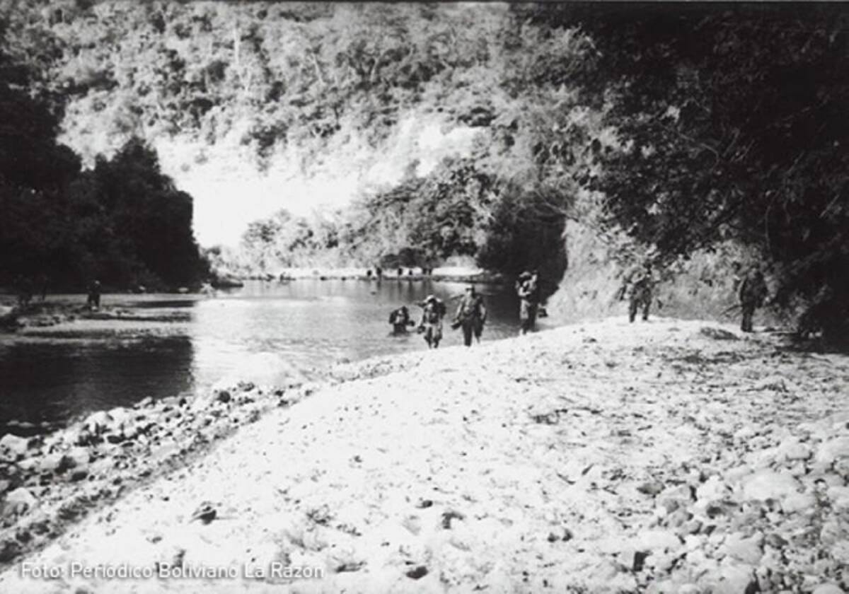 Esta foto muestra una caminata militar en busca de subversivos por los ríos del país andino, que el periodista Carlos Soria destaca como escenario de guerra.