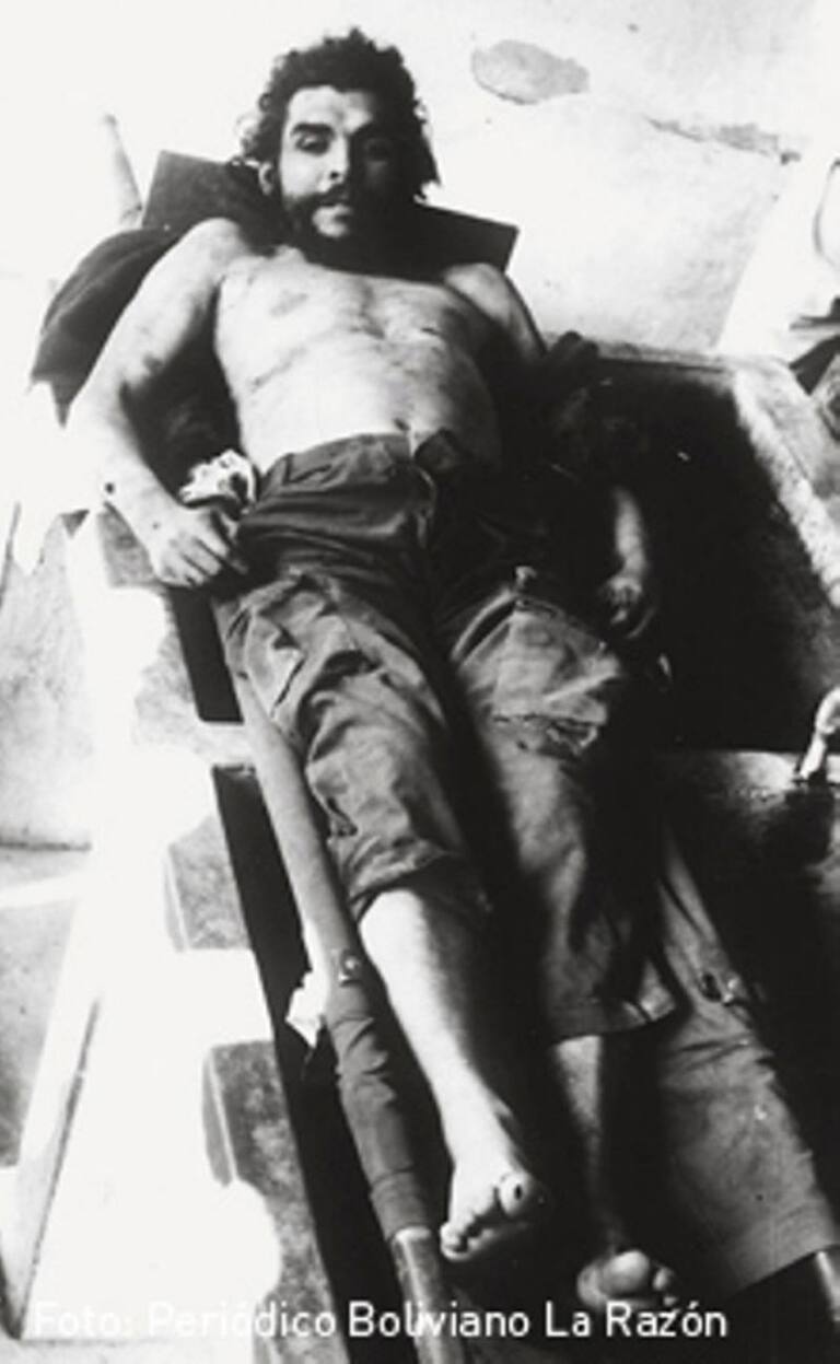 El Che’ en la lavandería del Hospital Señor de Malta de Vallegrande, en Bolivia. La foto, reseña La Razón, fue tomada por un soldado y estuvo guardada hasta ahora. A dicho lugar, el líder guerrillero fue trasladado tras su ejecución, y se le expuso con los ojos abiertos como trofeo de guerra.