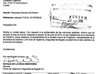 La secretaría de gobierno de Bogotá, a través del Fondo de Vigilancia y seguridad, decidió retirar inicialmente 4 de las nueve columnas vigilantes instaladas en la ciudad en el año 2008 por un valor de 460 millones de pesos y que no dieron ningún tipo de resultado