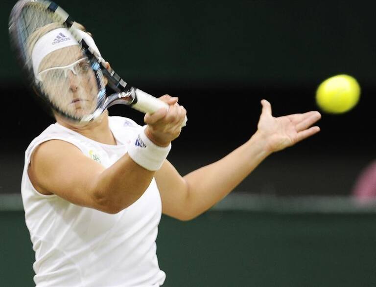La tenista belga Kirsten Flipkens devuelve la bola durante el partido de cuartos de final del torneo de Wimbledon.