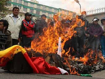 Decenas de miles de personas protestaron hoy ante la embajada de Estados Unidos de La Paz y quemaron banderas de ese país, España, Francia, Italia y Portugal, cuyos Gobiernos han sido acusados por el presidente Evo Morales de haber puesto trabas a su tránsito aéreo la semana pasada en Europa. Muchos de los asistentes a la movilización eran comerciantes minoristas, entre ellos miles de mujeres indígenas aimaras, que ocuparon durante varias horas el centro de La Paz y la avenida Arce, una de las principales arterias de la ciudad. En esa vía se encuentran las sedes de varias embajadas, entre ellas las de Estados Unidos y España. "Los hermanos bolivianos estamos muy dolidos por el acontecer y por esa discriminación que ha hecho Estados Unidos, España, Italia Portugal y otros países" al presidente Evo Morales, dijo el máximo dirigente del sector comercial de la vecina ciudad de El Alto, Braulio Rocha. Los manifestantes también pidieron la expulsión de los embajadores de esos países al considerar que el trato dado al mandatario fue una ofensa para el pueblo boliviano. "Nuestra Bolivia por más pequeñita que sea se merece un respeto