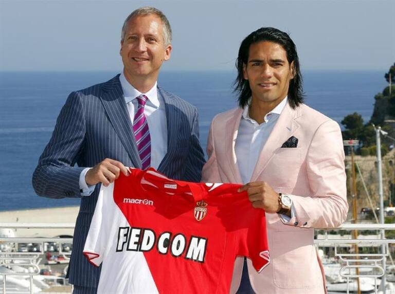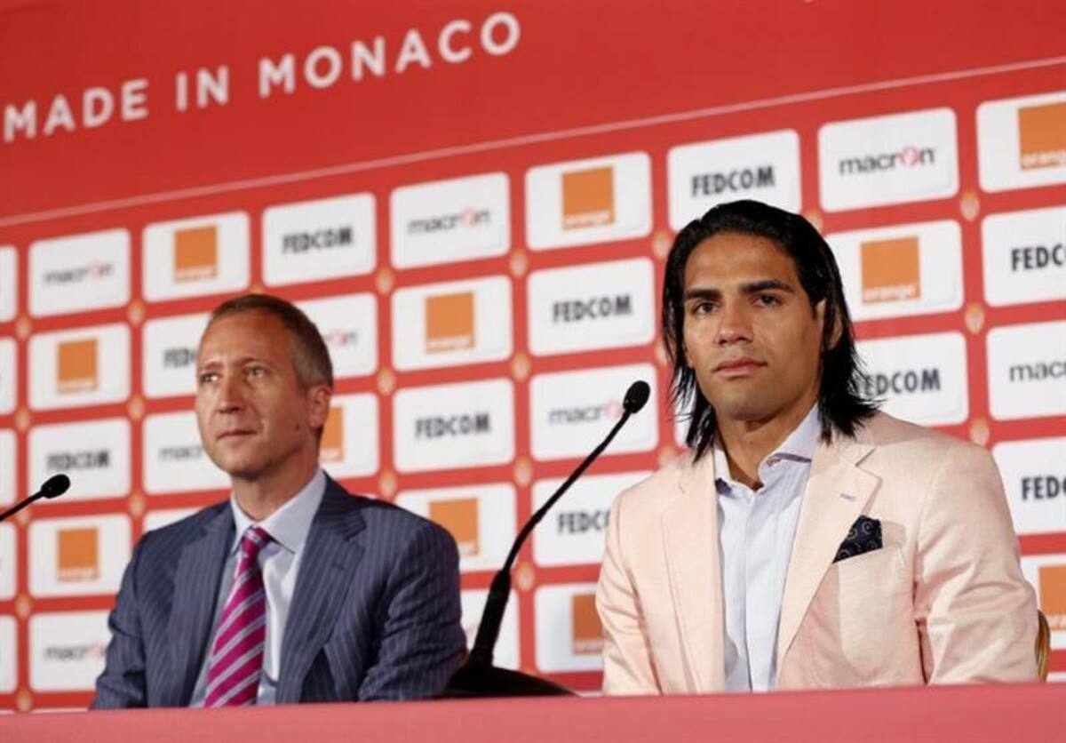 • El delantero colombiano Radamel Falcao (d), junto al director deportivo del AS Mónaco, Vadim Vasilyev, durante una rueda de prensa celebrada con motivo de su presentación como nuevo jugador del equipo en Mónaco.