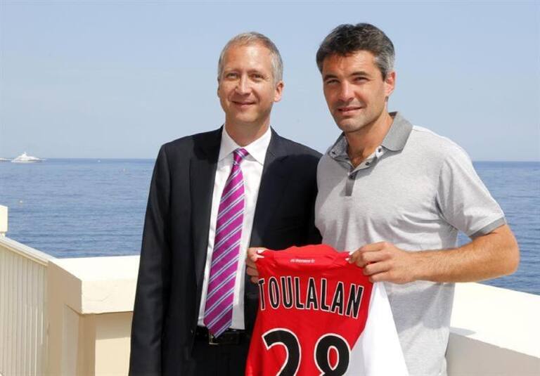• El nuevo jugador francés del AS Mónaco, Jeremy Toulalan, posa para los medios junto al director del club, Vadim Vasiley (izda), durante su presentación