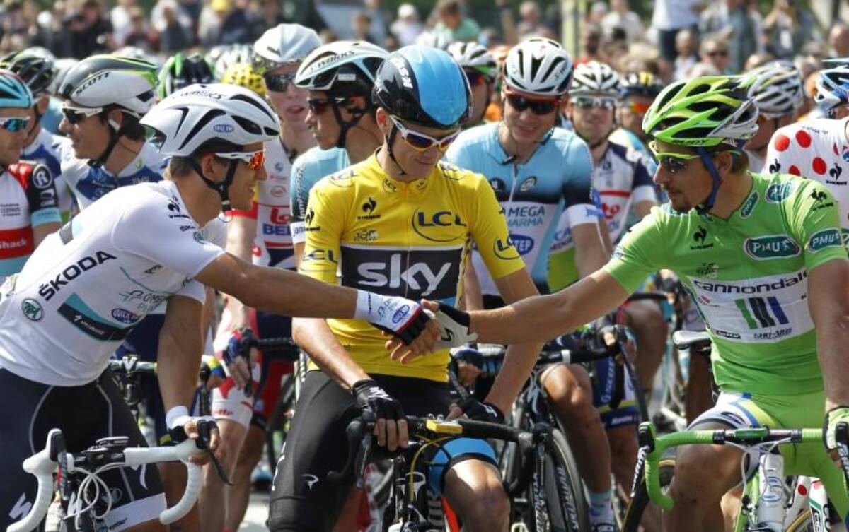 El ciclista británico Christopher Froome (c), del Sky, el polaco Michal Kwiatkowski (i), del Omega Pharma, y el eslovaco Peter Sagan (d) del Cannondale, antes del comienzo de la duodécima etapa del Tour de Francia, este jueves 11 de julio de 2013. EFE/Guillaume Horc