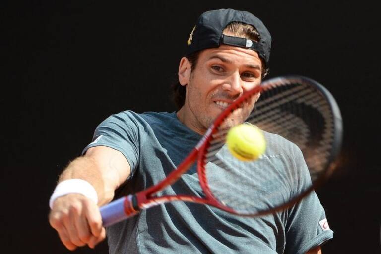 El tenista alemán Tommy Haas devuelve una bola al letón Ernests Gulbis durante un partido de segunda ronda del torneo de tenis de Stuttgart. EFE/Marijan Murat