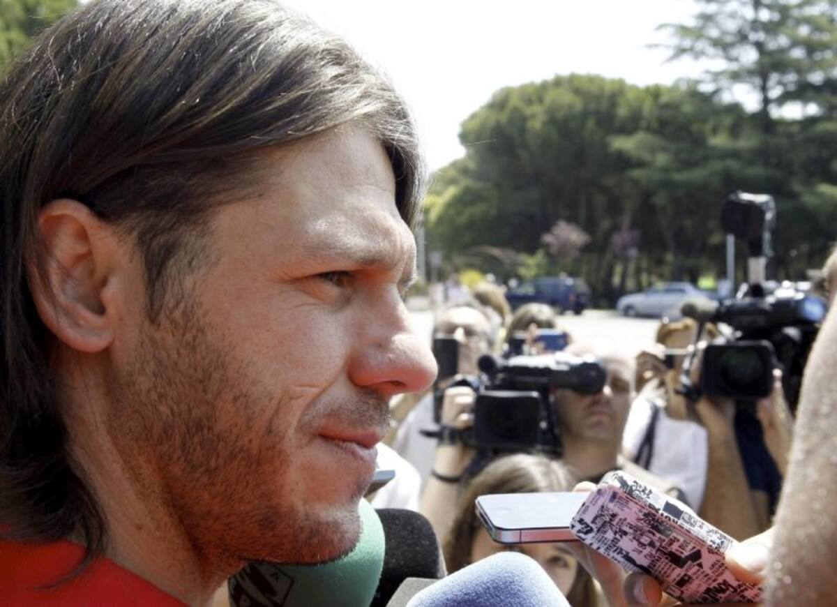 El defensa argentino Martín Demichelis atiende a los medios de comunicación tras pasar el reconocimiento médico con el Atlético de Madrid. EFE/Ángel Díaz