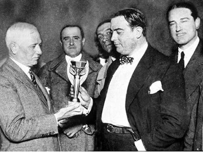 Foto 6 de 17Jules Rimet, presidente de la FIFA, presenta el trofeo ‘Jules Rimet’ a Raúl Jude, miembro de la asociación paraguaya de fútbol. El último equipo en recibir este trofeo fue Brasil, ya que se dejó de entregar en 1970.
