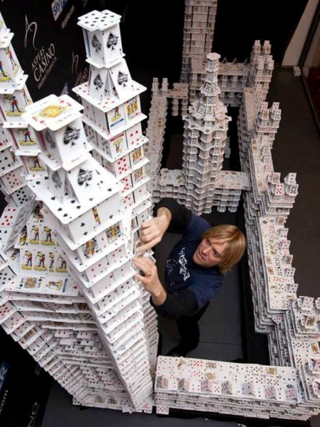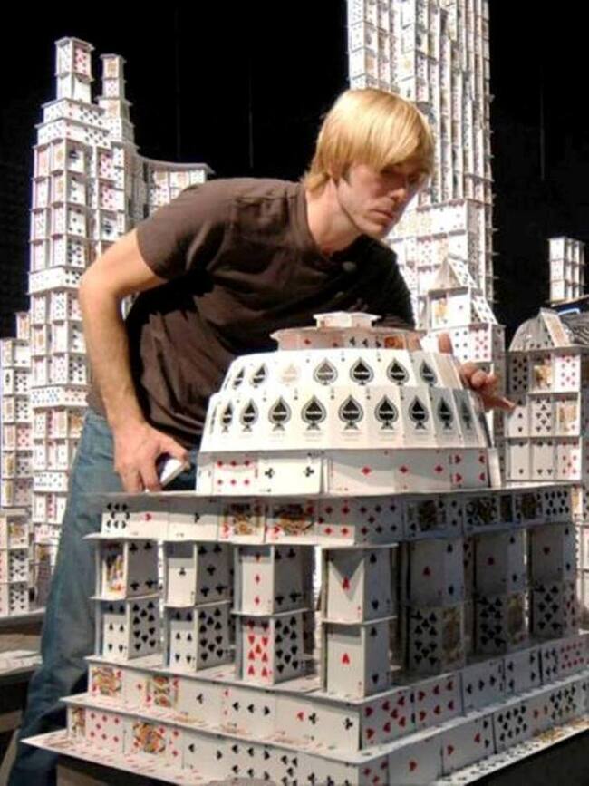 Bryan Berg es un 'cardstacker' (apilador de cartas) profesional, que construye monumentos a gran escala. Berg ha mantenido el récord mundial Guinness para la casa más alta del mundo construída con Naipes.