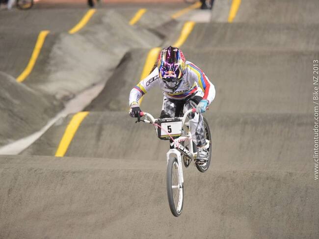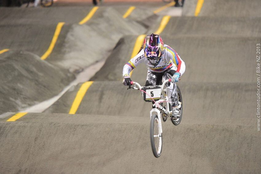 Mariana Pajón durante los entrenamientos en el Vector Arena, un día antes de iniciar las series clasificatorias para las finales. Foto: Clinton Tudor, Facebook BMX WC