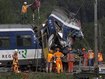 El portavoz de la Policía Cantonal de Vaud, Jean-Christophe Sauterel, dijo en una conferencia de prensa que "la falta de respeto de una señalización luminosa es la hipótesis privilegiada" sobre el motivo del accidente. "El fiscal espera el resultado de los exámenes que harán los expertos (...), pero ésa es la tesis que estamos privilegiando", indicó. Los trenes que colisionaron de manera frontal en la localidad suiza de Granges-près-Marnand (cantón de Vaud) transportaban a 45 personas, de las que 40 eran pasajeros y que sufrieron heridas de diversa consideración. La única víctima mortal fue uno de los maquinistas, cuyos restos pudieron ser recuperados esta madrugada de la cabina de conducción, que quedó completamente aplastada. "La longitud original de la cabina quedó reducida de ocho metros", explicó Sauterel. La deformación ha sido tal que no puede descartarse que haya restos de alguna otra víctima en el interior de esa parte del vagón, que está siendo conducido a un depósito de la compañía de trenes de Suiza para excluir la presencia de otros cuerpos mediante "una operación extremadamente delicada". "En estos momento, no podemos excluir que haya algún pasajero atrapado", agregó el portavoz. Entre los heridos más graves, sólo tres permanecen hoy hospitalizados, mientras que los otros 22 hospitalizados han sido dados de alta. Otros nueve pasajeros con heridas leves fueron atendidos en el lugar del accidente, mientras que once resultaron indemnes.