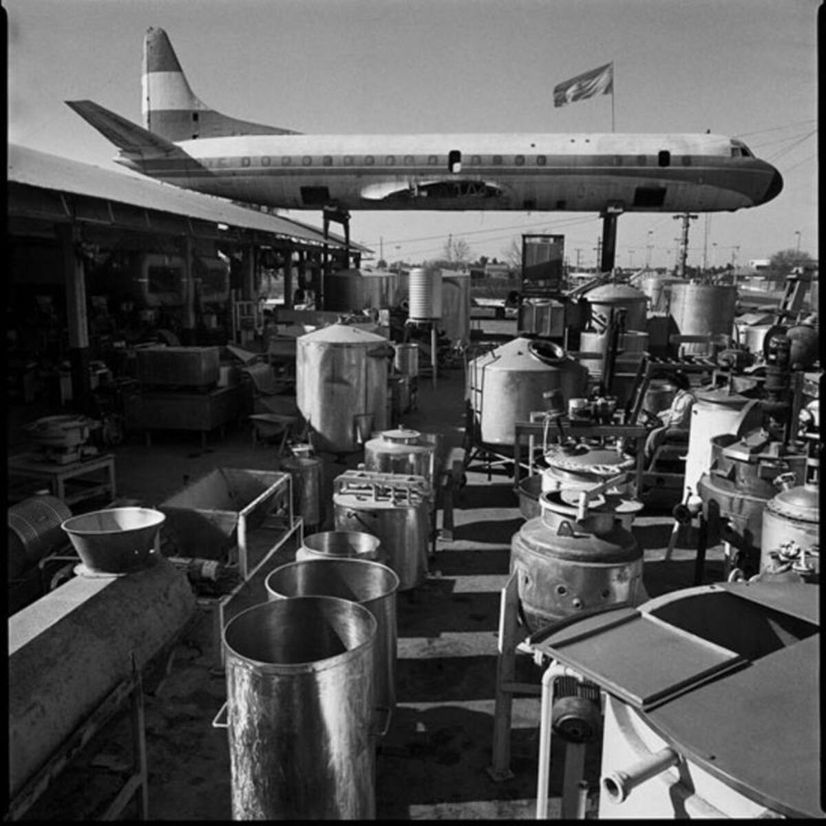 La fotografía muestra una aeronave utilizada para lanzar opositores al mar en los llamados “vuelos de la muerte” en Argentina, hoy instalada en un local de materiales de construcción en las afueras de Buenos Aires.