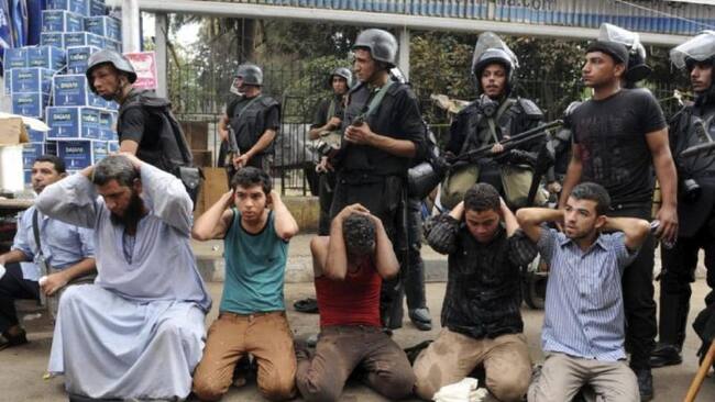 Foto 5 de 20Varios miembros de las fuerzas de seguridad egipcias vigilan a un grupo de manifestantes arrestados durante el asalto a uno de los dos asentamientos de los simpatizantes del depuesto presidente Mohamed Mursi en la plaza del Nahda, cerca de la Universidad de El Cairo.